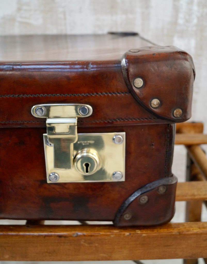 A superb pair of R.W.Forsyth full leather suitcases, made from full leather hide, with brass fittings and a beautiful deep green leather interior lining. These cases are well made and of a high quality, the lids are supported by leather straps, the underside has 6 brass stud feet, these were to raise the cases off the ground for protection, the locks are made from brass and the corners are leather with brass stud work. The makers name is embossed in gold on the inside of the lids (Makers R.W Forsyth Ltd Edinburgh Glasgow). C1900