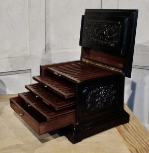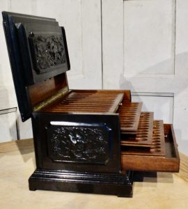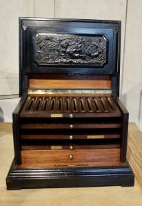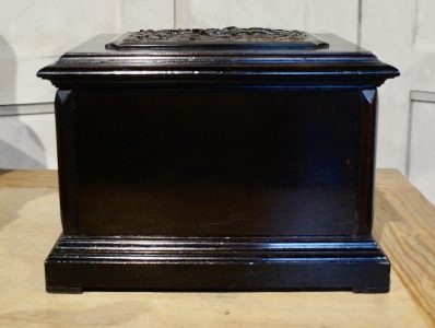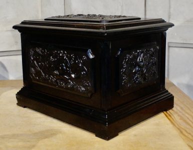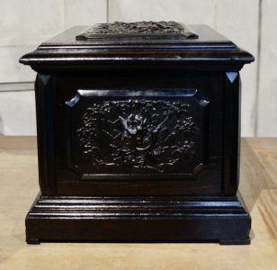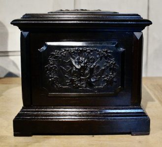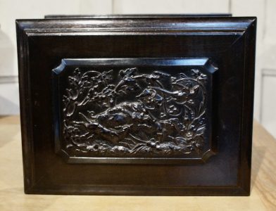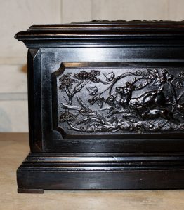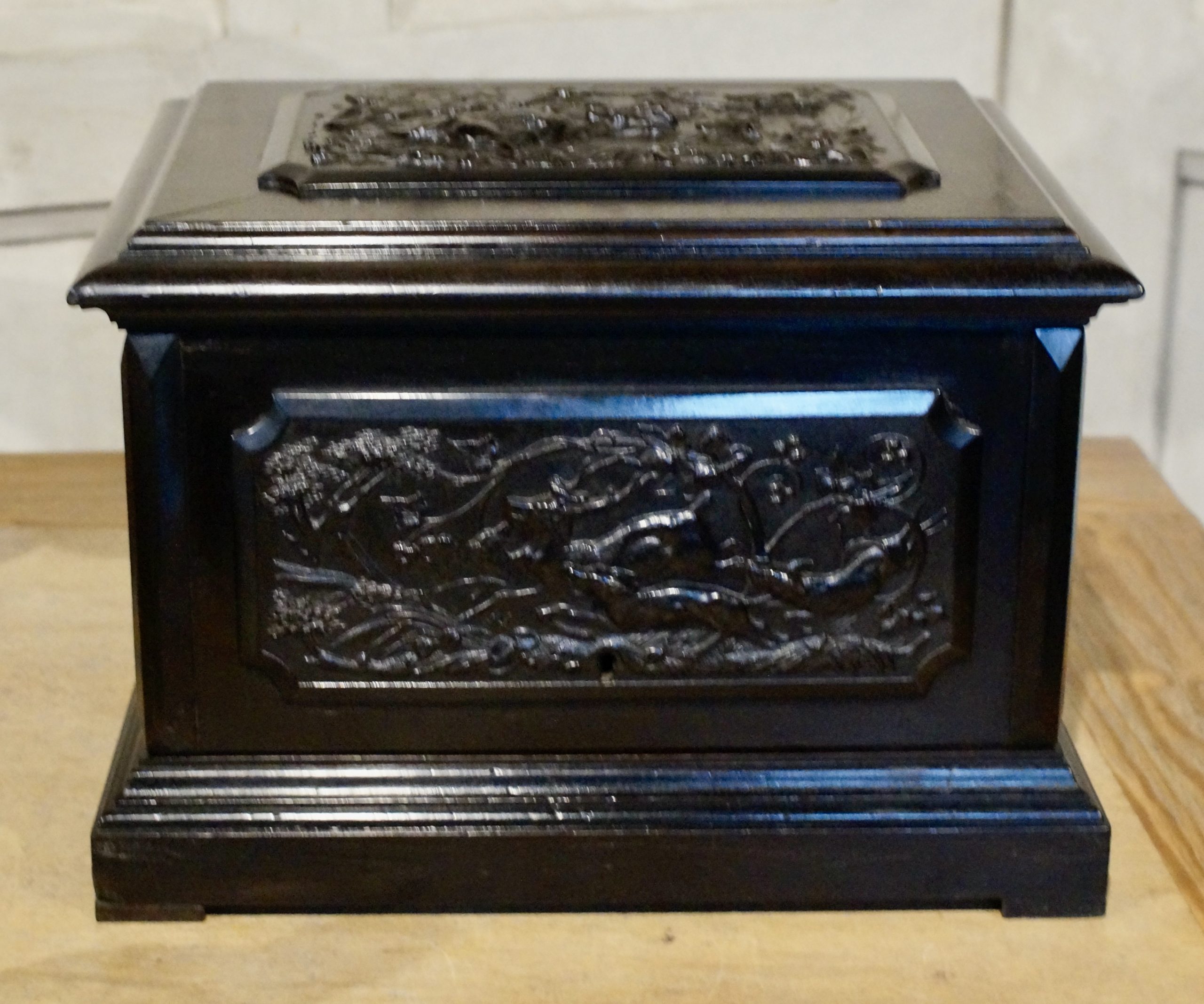 A stunning Black Forest Humidor. This beautiful Humidor has superb hand carved detailing on then outside, depicting a wild boar scene & other woodland scenes all surrounding the outer case, complete with a hinged cover enclosing the humidor compartments of 5 pull out drawers. C1870.