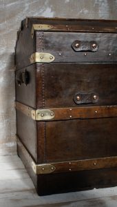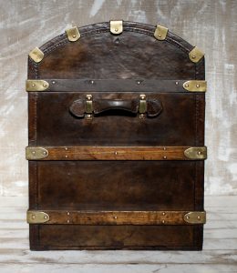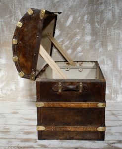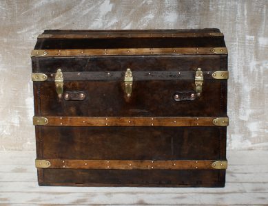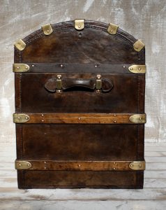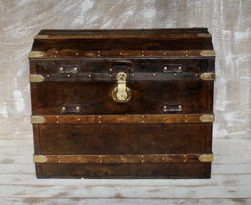 Antique dome-topped, leather-covered trunks, popular in the 19th century (especially 1860s–1890s), were designed for travel by stagecoach, ship, and early rail. Their curved “camelback” shape was intended to prevent other luggage from being stacked on top, ensuring they remained on top of piles and preventing water accumulation.
