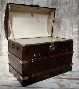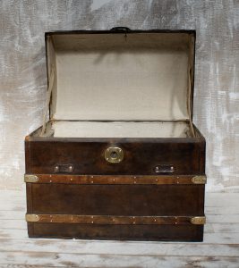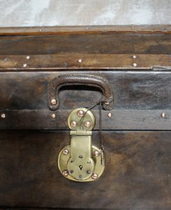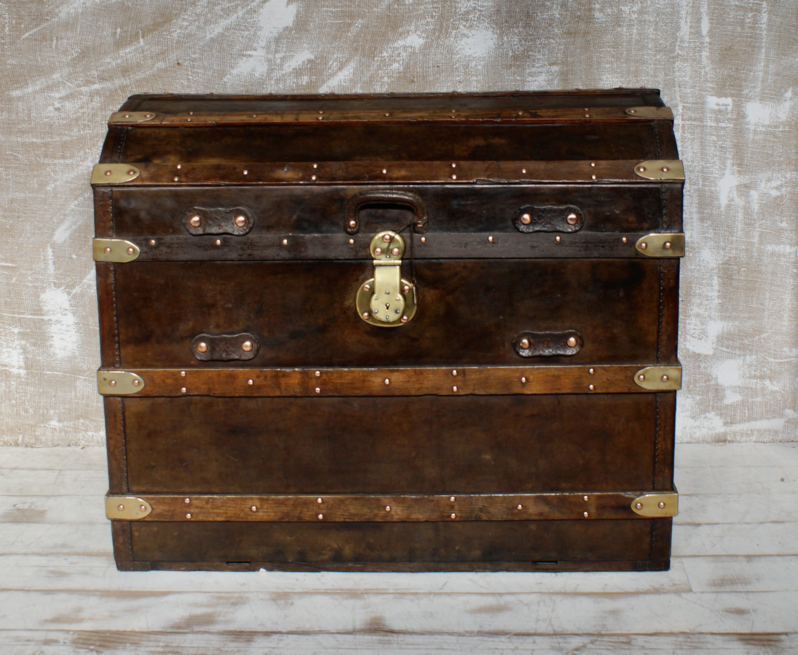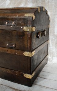 They were typically built with wood (often oak), covered in hides (deer, cow), and featured reinforced metal, iron, or brass trim and studs for durability. The dome shape offered strength and prevented stacking during travel.