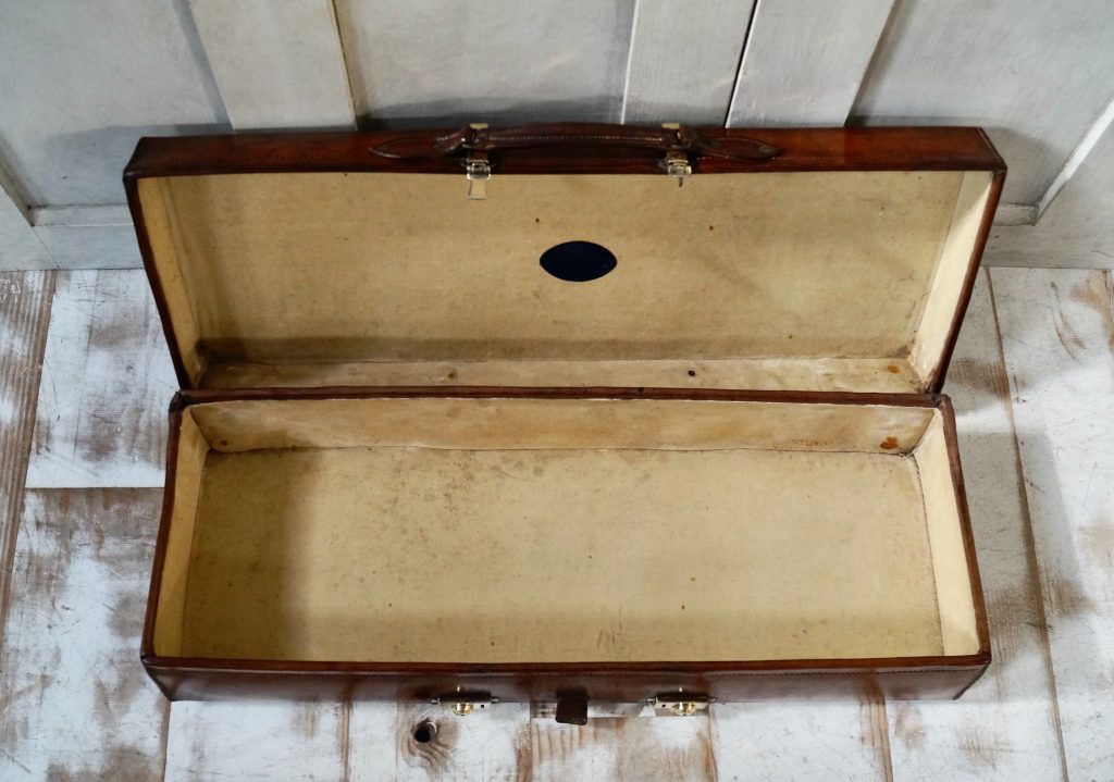 A Superb “Revelation” Expanding Leather Suitcase. Made from English leather with brass fittings and locks, labelled “Revelation British Made”. The Revelation being this suitcase expands from an over night case to a weekender. The hinges and the front hasps elongate, turning the case into almost twice its size. Inside is the makers label “The Revelation Expanding Suitcase Co Ltd” 169 Piccadilly London W1. The initials W.A.B. is stamped on the top . C1920