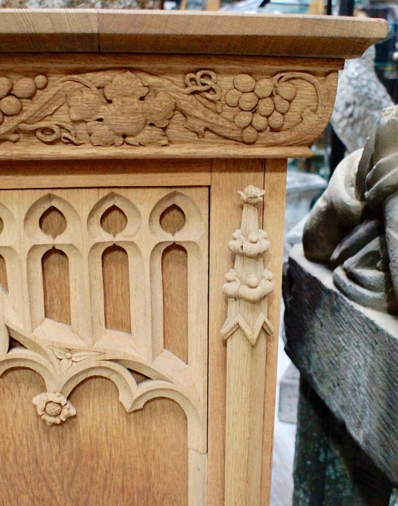 Beautiful Example of 1920’s hand carved High Gothic Alter table in bleached Oak, this piece is a stunning example of early craftsmanship, with hand carvings that complete this beautifully finished piece of Gothic furniture. This piece would be a perfect Kitchen Island or a stunning sideboard for any home or shop display. Makers name & date on this item.