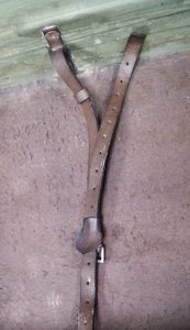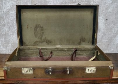 A rare and very unusual vintage Moynat motoring suitcase. Made from canvas, with a leather handle, brass corners & locks with Moynat stamped on them, the case still retains the original brass luggage rings to the lid for strapping to the car. The makers brass plaque “LES MALLES MOYNAT” depicting an automobile, a train and a steam liner is pinned on the outside of the case, and a maker label on the inside of the lid, which has two leather straps inside to hold items in place. C1930