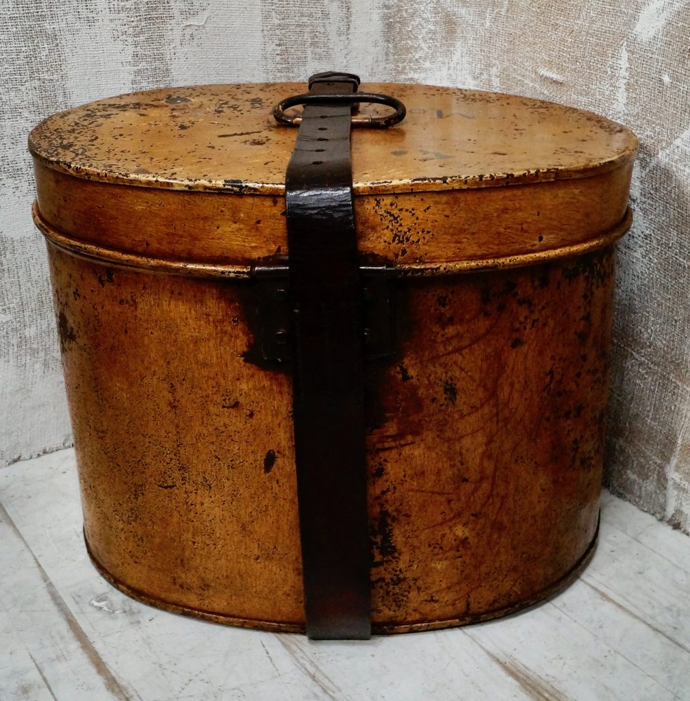 Antique Victorian Family Hat Box. Made from Steel with the original scumble glazed finish, with the original aqua blue interior, a hinged lid, loop carry handle and a tab fastening latch, and to complete the piece, a leather strap for extra security. C1890
