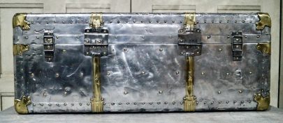 A great example of aviation history, this polished aluminium trunk has brass strapping, edges & stud work, still retaining the original satin lining & key. These trunks were created using aluminium from a Lockheed Ventura, after the war materials were scarce and the Government ‘Utility Scheme’ of 1942 rationed wood, and stated that any available timber was to be used for the reconstruction of houses. C1940’s